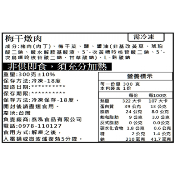 成分: 豬肉(肉丁)、梅干菜、鹽、醬油(非基改黃豆、琥珀酸二鈉、酸水解胺基酸液、5'-次黃嘌呤核苷酸二鈉、5'-次鳥嘌呤核苷酸二鈉、甘草酸鈉)、L-麩酸鈉 規格: 300克(適合2人)、600克(適合4人)、1公斤(適合8-10人) 有限期限: 一年 賞味期: 三個月